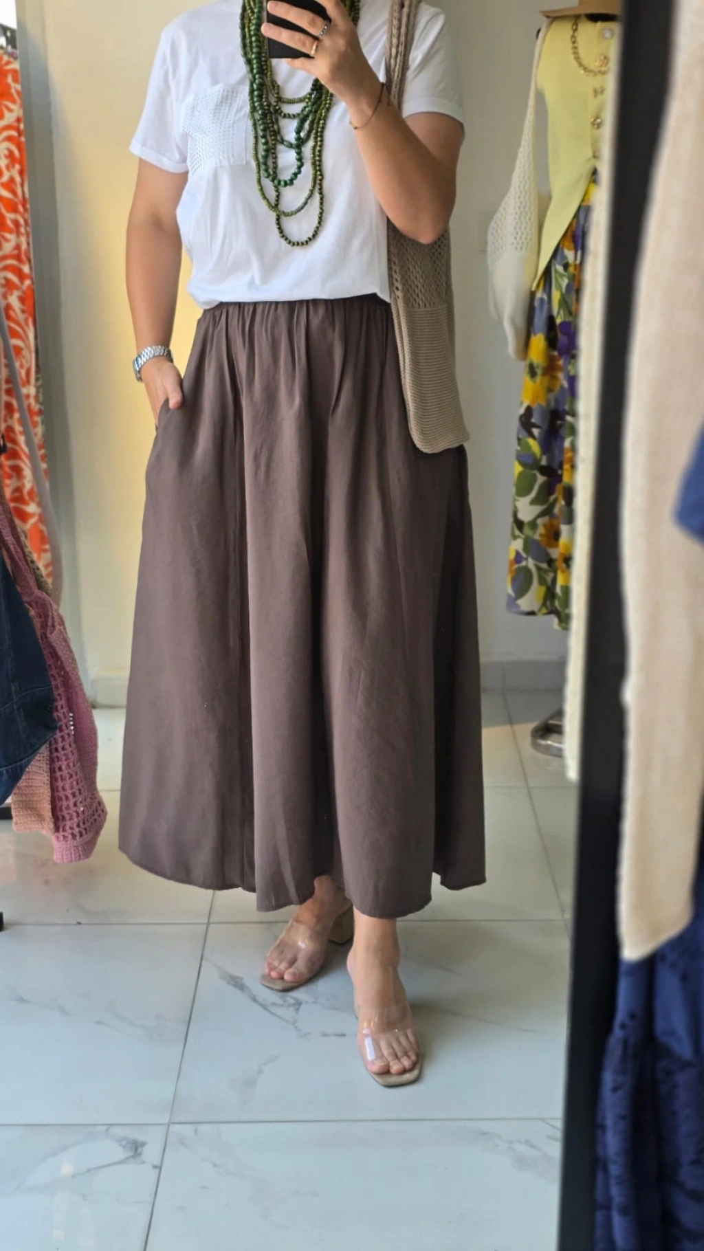 Kahverengi Lastikli Midi Kloş Etek