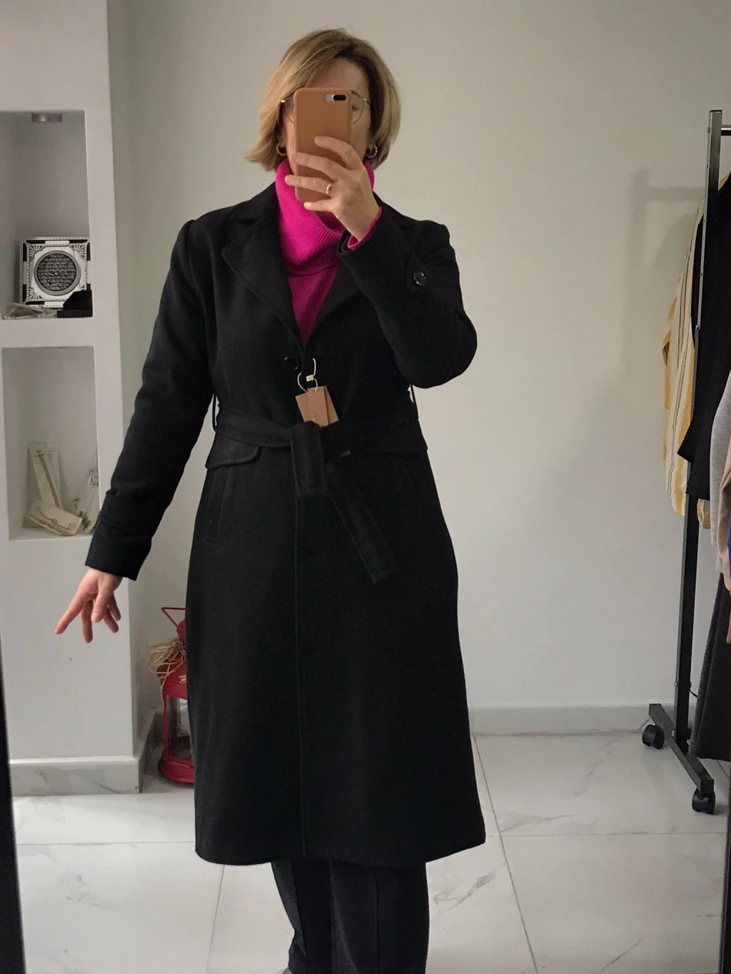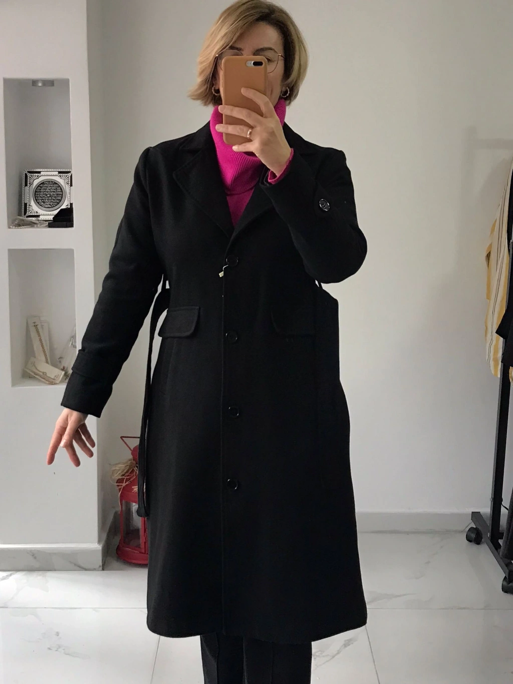 Uzun Siyah Kuşaklı Kaşe Kaban
